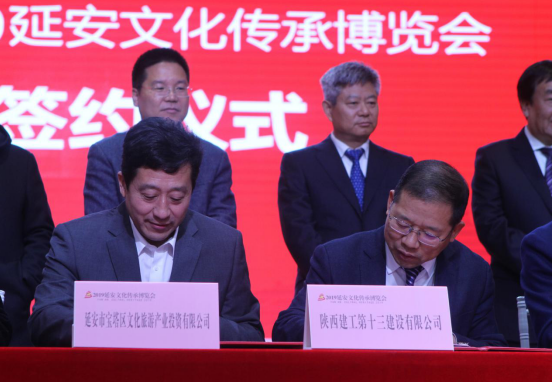 陜西建工第十三建設(shè)有限公司董事長(右)與延安市寶塔區(qū)文化旅游產(chǎn)業(yè)投資有限公司董事長米強(左)代表雙方簽約。