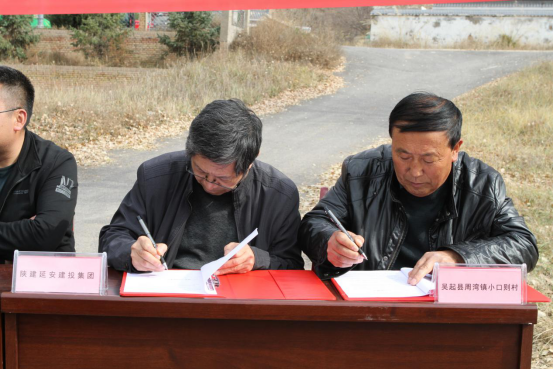陜建延安建投集團(tuán)總經(jīng)理苗壯(左)與吳起縣周灣鎮(zhèn)小口則村支部書(shū)記雷鳴寬(右)代表雙方簽訂推銷(xiāo)協(xié)議。
