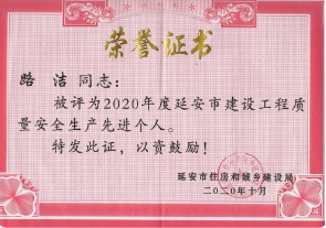 路潔、郭塬浩榮獲“延安市建設(shè)工程質(zhì)量安全生產(chǎn)先進(jìn)個(gè)人”榮譽(yù)稱號(hào)。