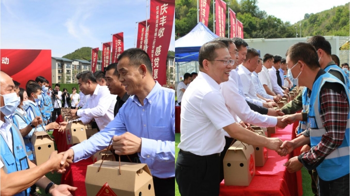 慰問活動現(xiàn)場,與會領導為農民工朋友們發(fā)放慰問品,并隨后觀看了“慶豐收、感黨恩”慰問演出。