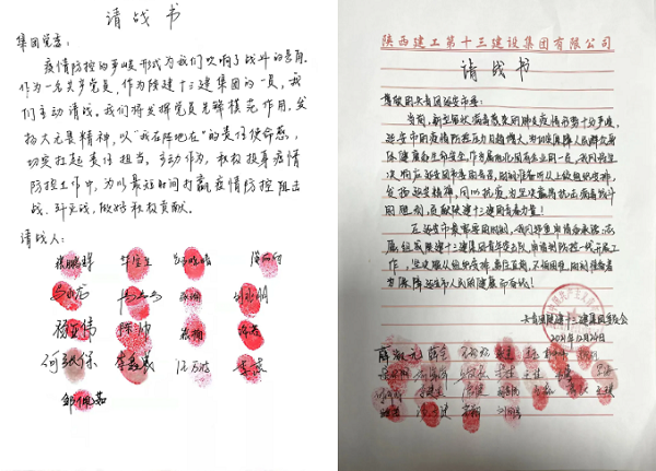 為了積極應(yīng)對嚴(yán)峻的疫情防控形勢,在陜建十三建集團(tuán)黨委的號召下,全體黨員干部、團(tuán)員青年、90后、00后紛紛遞交請戰(zhàn)書,請?jiān)父耙痪€服務(wù)疫情防控工作,助力延安市打贏疫情防控阻擊戰(zhàn)、殲滅戰(zhàn)。