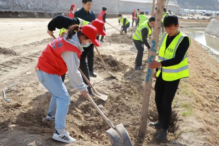 活動現(xiàn)場,大家熱情高漲、干勁十足,三五人一組,分工合作,揮鍬鏟土,放置樹苗,提水澆灌,踏土正苗,每道工序都有條不紊,到處一片熱火朝天的勞動場景。經(jīng)過2個(gè)多小時(shí)的辛勤勞動,一排排綠柳整齊地挺立在河道兩旁,為紅色南泥灣增添了一抹新綠、播種了一份希望。