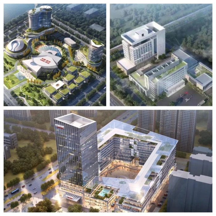 項(xiàng)目鳥瞰圖:上左-國際健美健身聯(lián)合會IFBB-CBBA文化發(fā)展交流中心項(xiàng)目;上右-空港領(lǐng)航大廈項(xiàng)目二期;下-渭城商務(wù)功能區(qū)項(xiàng)目