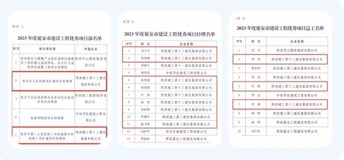 集團(tuán)延安市人民醫(yī)院改擴(kuò)建項(xiàng)目經(jīng)理部、延安市第二人民醫(yī)院(市傳染病專(zhuān)科醫(yī)院)改擴(kuò)建項(xiàng)目經(jīng)理部、陜甘寧邊區(qū)政府保安處革命紀(jì)念館項(xiàng)目經(jīng)理部被評(píng)為“2023年度延安市建設(shè)工程優(yōu)秀項(xiàng)目部”;吳小平、雷亞雄、高哲源、張溪強(qiáng)、汪強(qiáng)、湯勇、宋院輝等人被評(píng)為“2023年度延安市建設(shè)工程優(yōu)秀項(xiàng)目經(jīng)理”;李杰、忻煜、申虎等人被評(píng)為“2023年度延安市建設(shè)工程優(yōu)秀項(xiàng)目總工”。