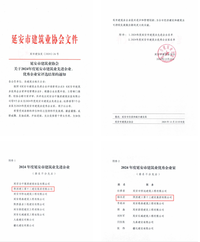 日前,延安市建筑業(yè)協(xié)會(huì)公布了2024年度延安市建筑業(yè)先進(jìn)企業(yè)、優(yōu)秀企業(yè)家、項(xiàng)目經(jīng)理部、項(xiàng)目經(jīng)理、項(xiàng)目總工評(píng)選結(jié)果,陜西建工第十三建設(shè)集團(tuán)有限公司被評(píng)為2024年度延安市建筑業(yè)先進(jìn)企業(yè);集團(tuán)黨委副書記、總經(jīng)理?xiàng)钣篮晖颈辉u(píng)為優(yōu)秀企業(yè)家;師范路綜合整治項(xiàng)目部被評(píng)為建設(shè)工程優(yōu)秀項(xiàng)目部;雷慧東、上官松、拓振華、袁江、喬戰(zhàn)峰五名同志被評(píng)為優(yōu)秀項(xiàng)目經(jīng)理;汪洋、王海紅兩名同志被評(píng)為優(yōu)秀項(xiàng)目總工。